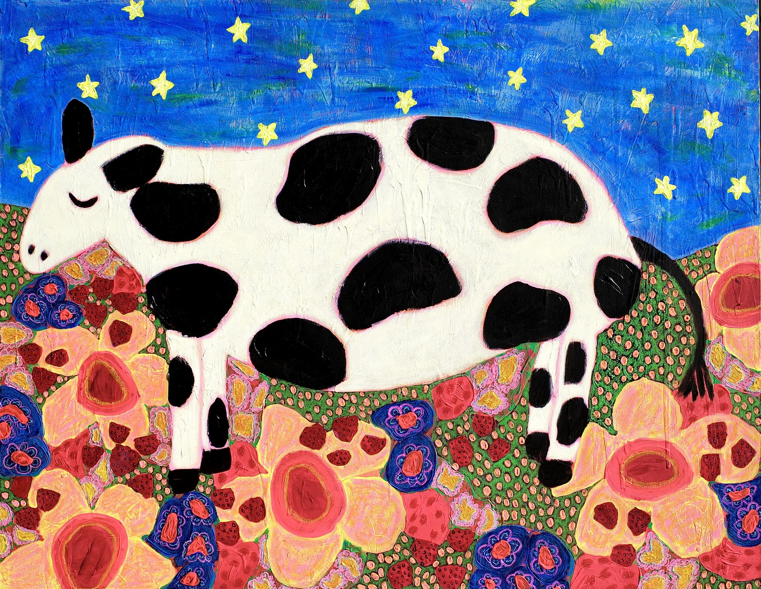 Details!!!!!! Dots, circles, flowers…I'm more confident this is going somewhere I'm going to like. But it still feels off. The cow is too pink..the sky is not right and the field of flowers is not working yet. Let’s change the cow color and add some more details…and get a better blue blasted on that sky!!